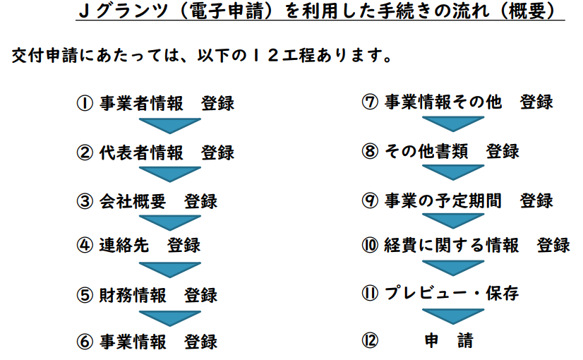 下表のフロー図のとおり、交付申請はJグランツシステムを使い、電子申請で行います。全12工程の入力が必要で、申請する内容以下のとおりです(公募毎に変更する場合があります。あくまで参考程度にご確認ください)。